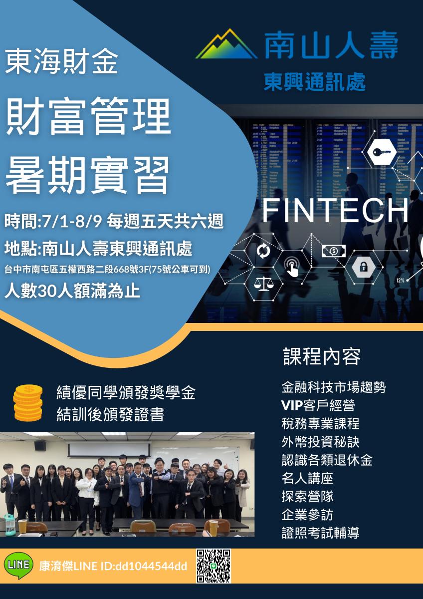 實習地點: 南山人壽東興通訊處 (台中市南屯區五權西路二段668號3樓)
