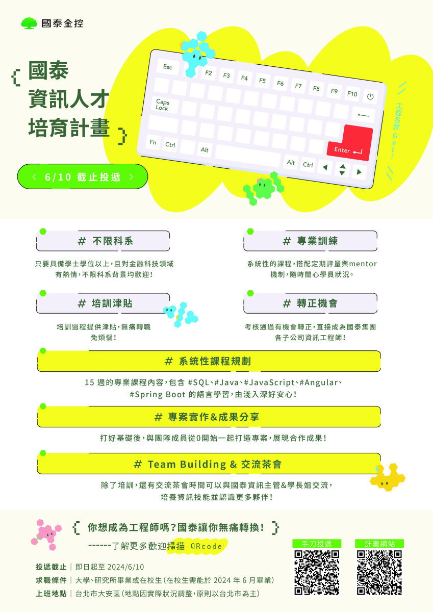 此培育計劃不分經驗背景教學(資訊0經驗亦可),透過系統化的課程安排、手把手指導,搭配mentor制度,讓加入培訓計畫的學生於結訓後具備金融業資訊領域基礎專業,並有轉正內部開發工程師的機會,歡迎同學們踴躍報名!