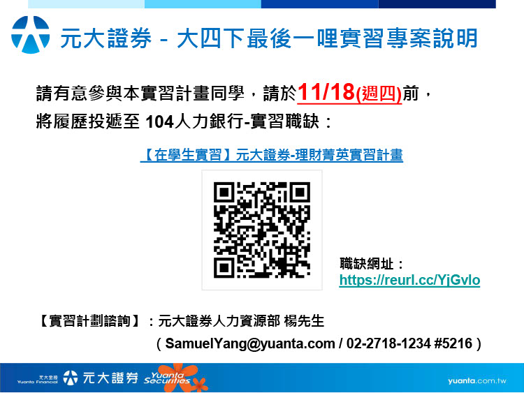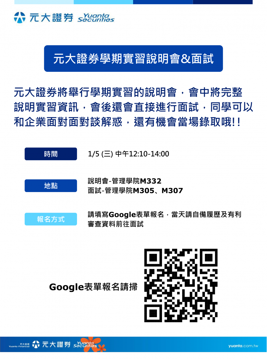元大證券2022學期實習說明會&面試--報名至1/4止