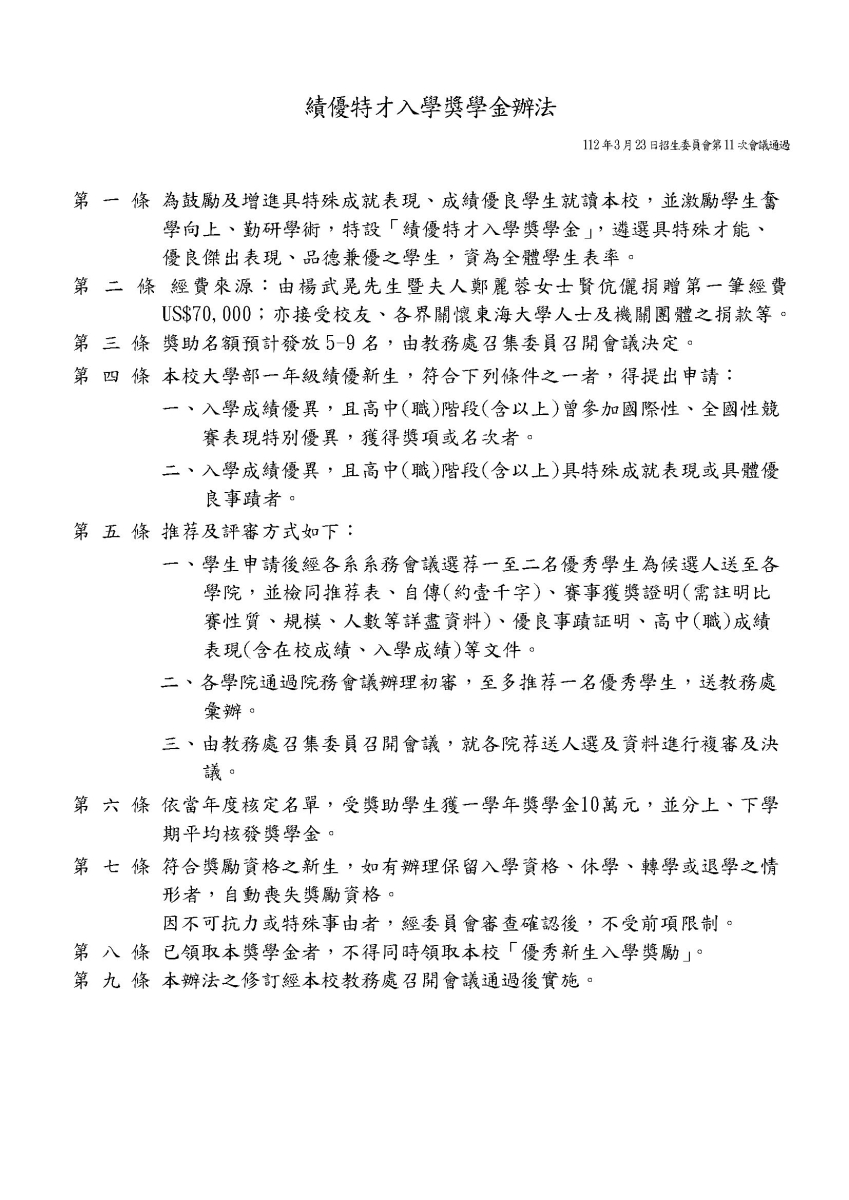 - 依本校「績優特才入學獎學金辦法」辦理(如下)