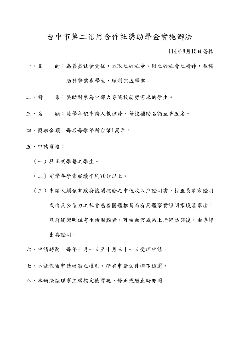 台中市第二信用合作社特別提供財金系獎助學金,歡迎有需要的同學踴躍申請!!