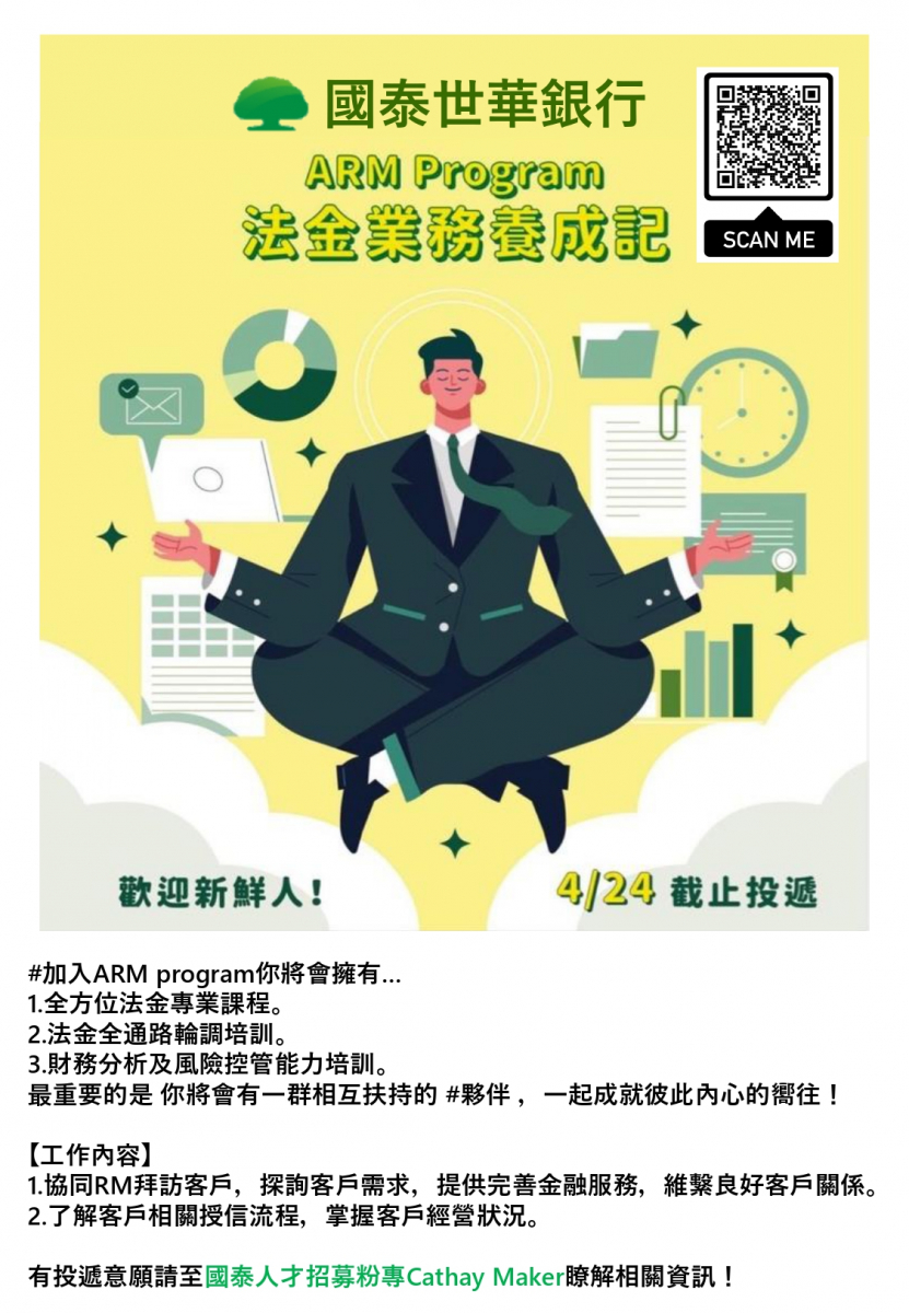 國泰世華法金業務菁英ARM Program行之有年,每年皆吸引許多新鮮人前來投遞。