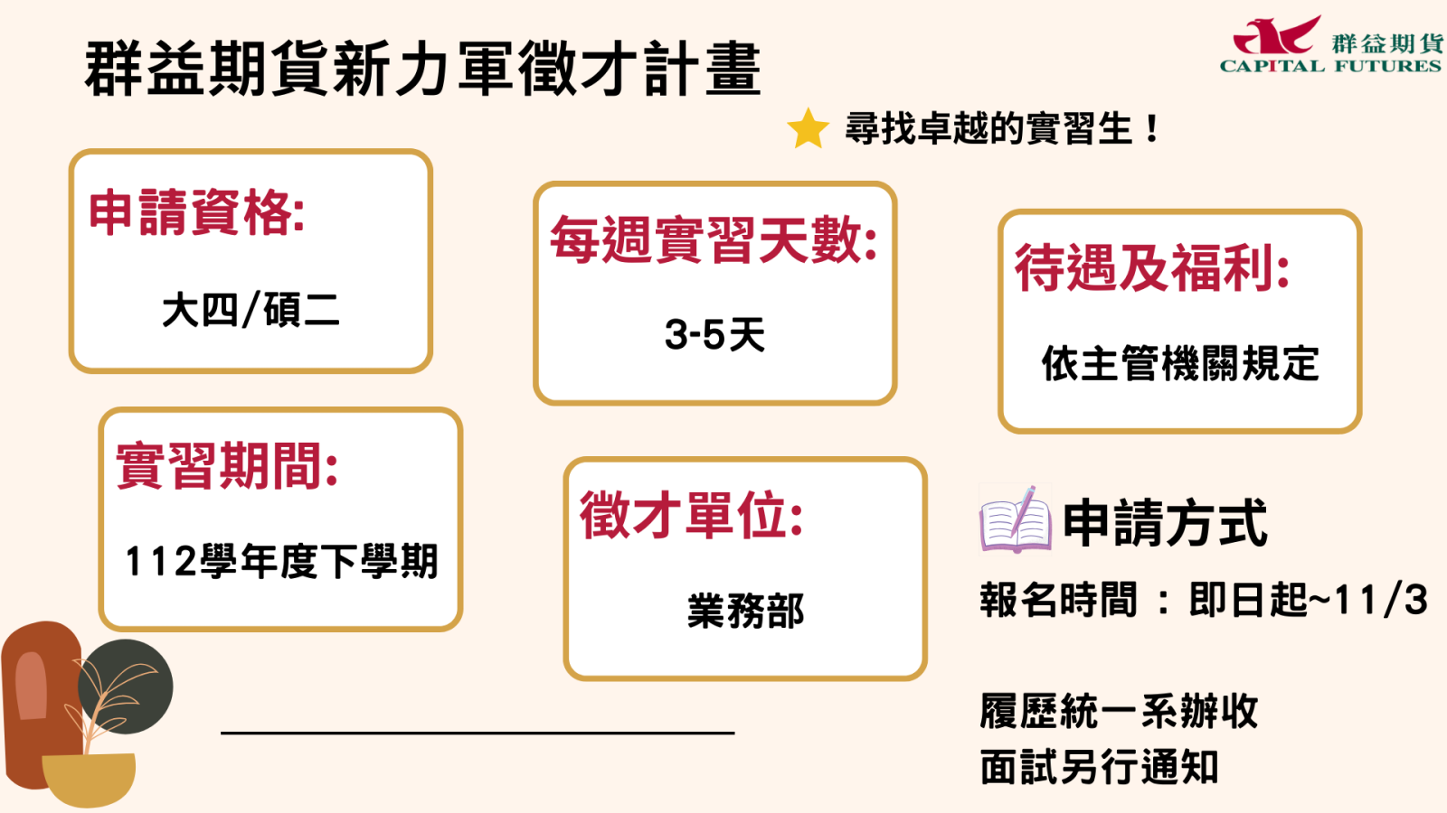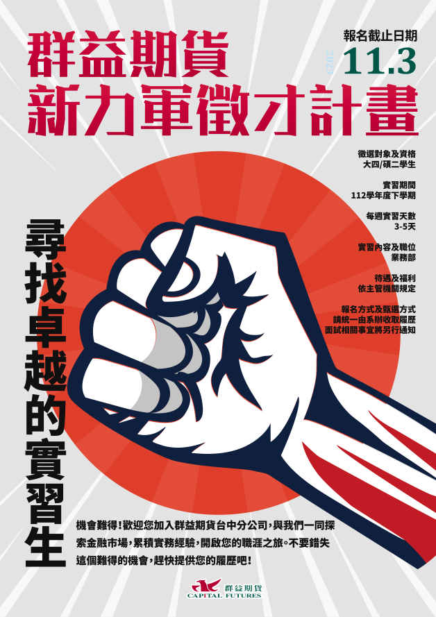 - 實習資格: 大四及碩二應屆畢業生 / 畢業後有心於期貨產業就業者