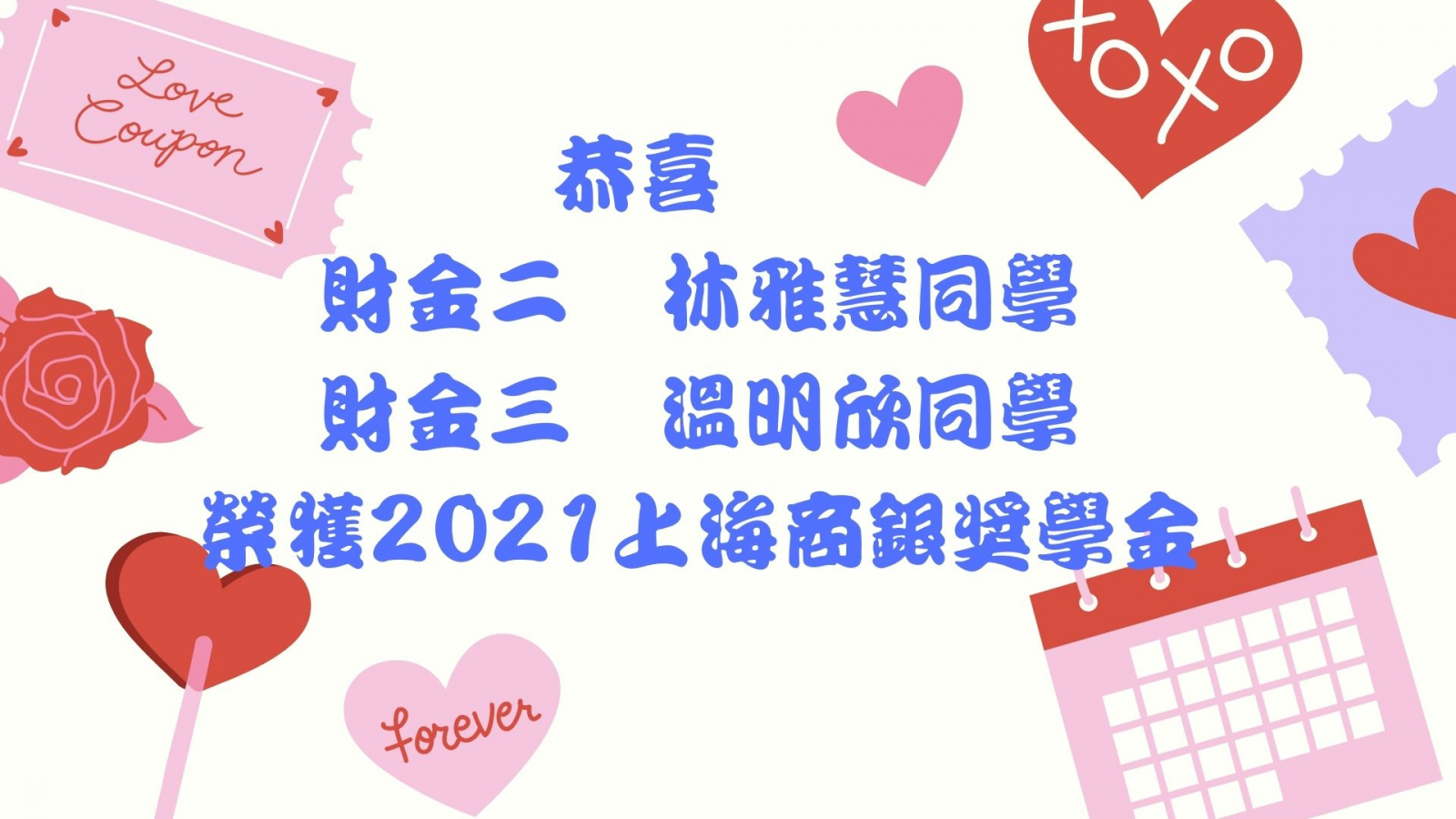 恭喜!!林雅慧、溫明欣兩位同學--榮獲上海商銀獎學金三萬元