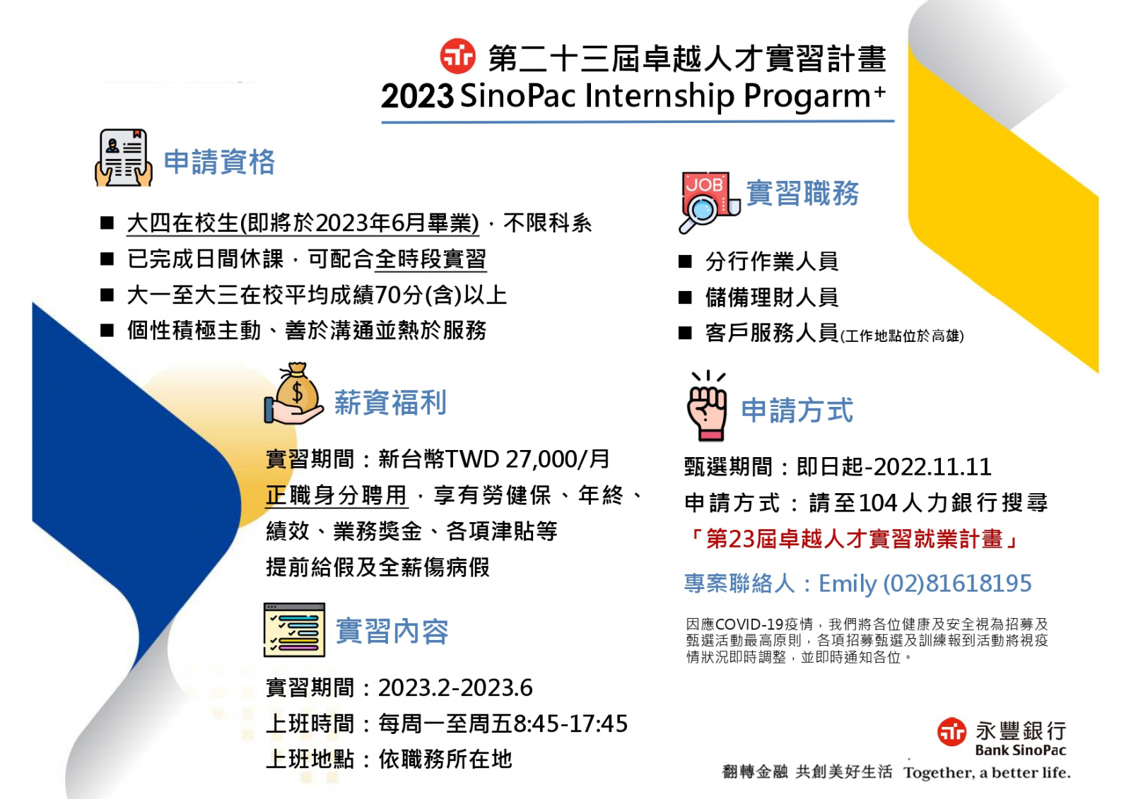 薪資福利:月薪$27,000(含伙食津貼),享勞健團保,其餘福利等同永豐正職員工,且實習期間年資可接續累計至畢業後