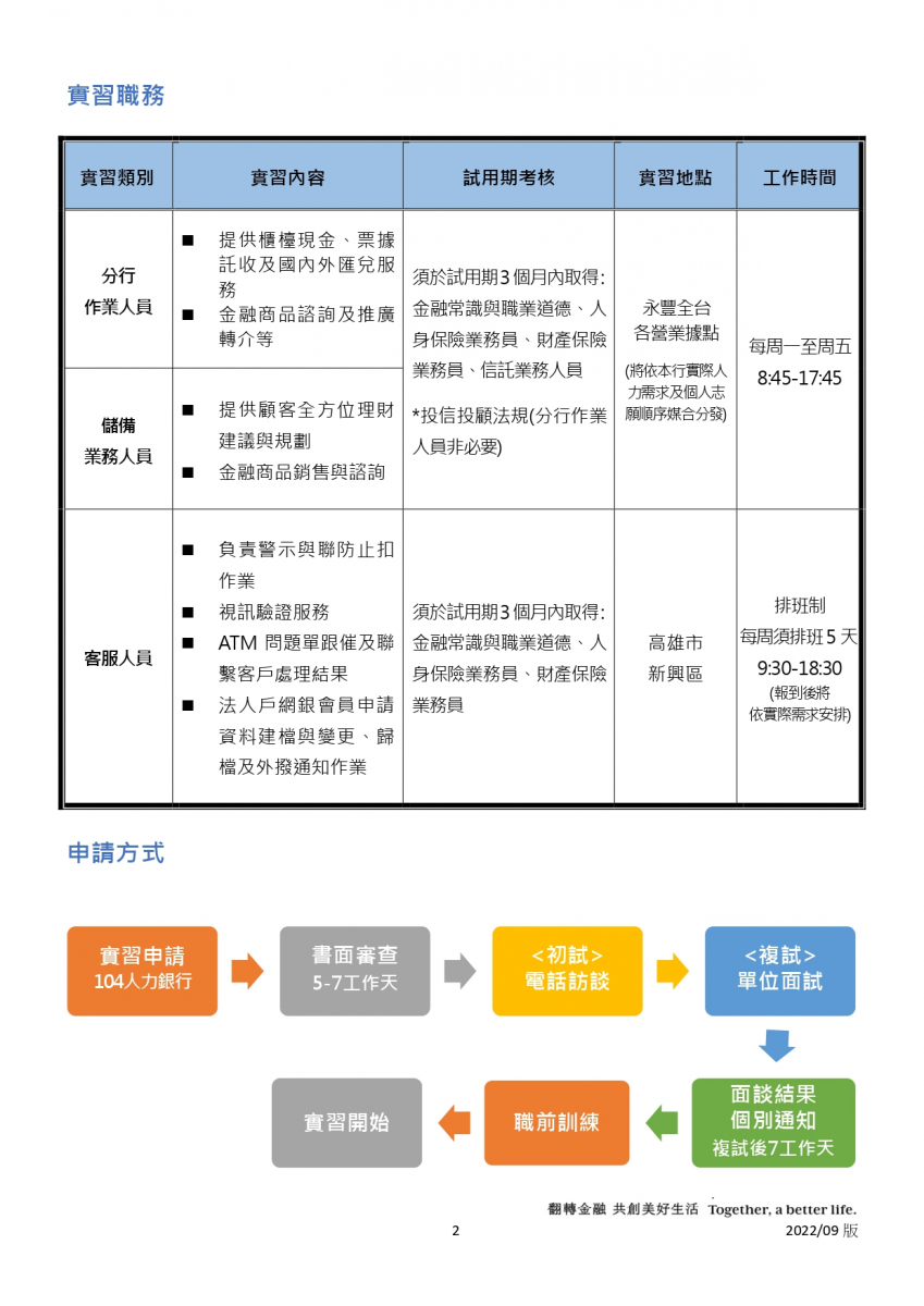 實習內容:採階段性學習一般櫃檯收付作業等、金融商品銷售及諮詢櫃畫其他主管交辦事項(實習期間無業績目標)