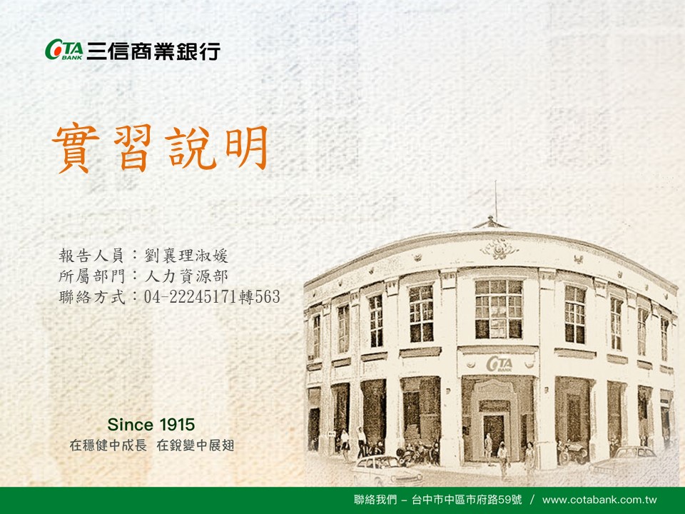 實習地點: 參酌個人志願及公司需求安排,主要以本行台中市各分行為實習地點
