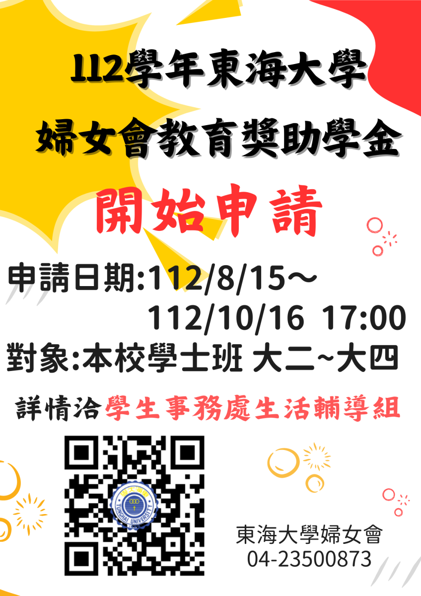 東海大學婦女會教育獎助學金--申請至10/16止