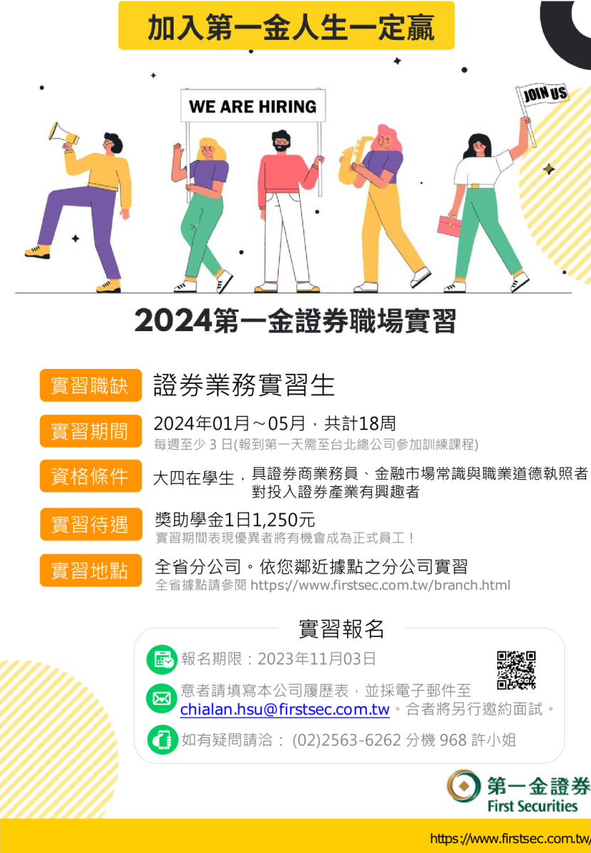 - 報名方式: 請參考服務據點,填寫第一金證券履歷表及告知書(請下載下方附件),並mail至 chialan.hsu@firstsec.com.tw,合者另行邀約面試