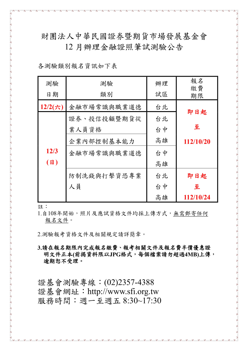 證基會112年度第四次金融證照筆試測驗公告