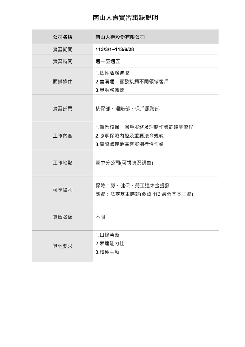 - 實習部門: 核保部、理賠部、保戶服務部