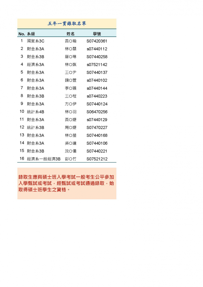 110學年度五年一貫錄取名單