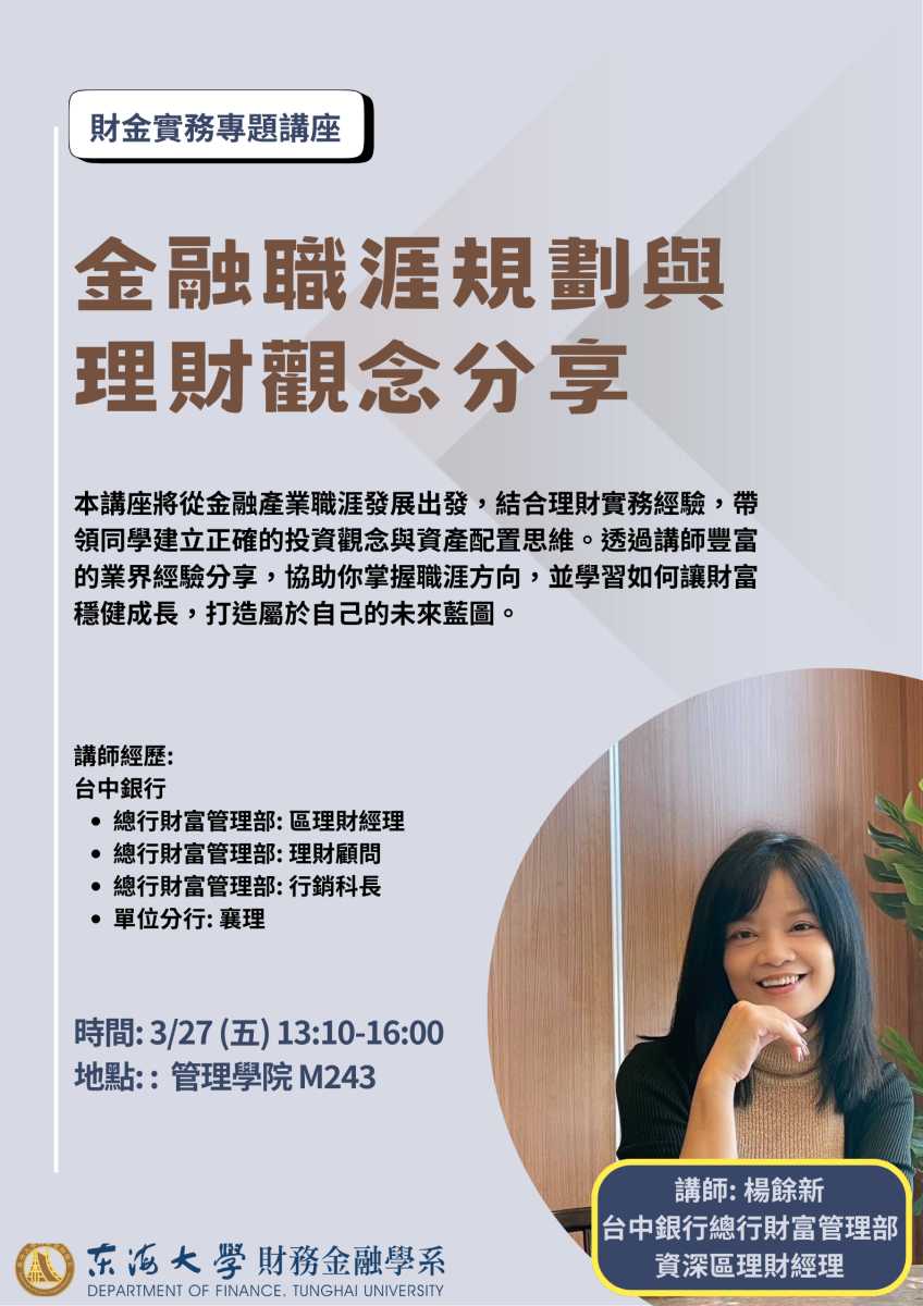- 講師: 台中銀行總行 財富管理部資深區理財經理 楊餘新經理