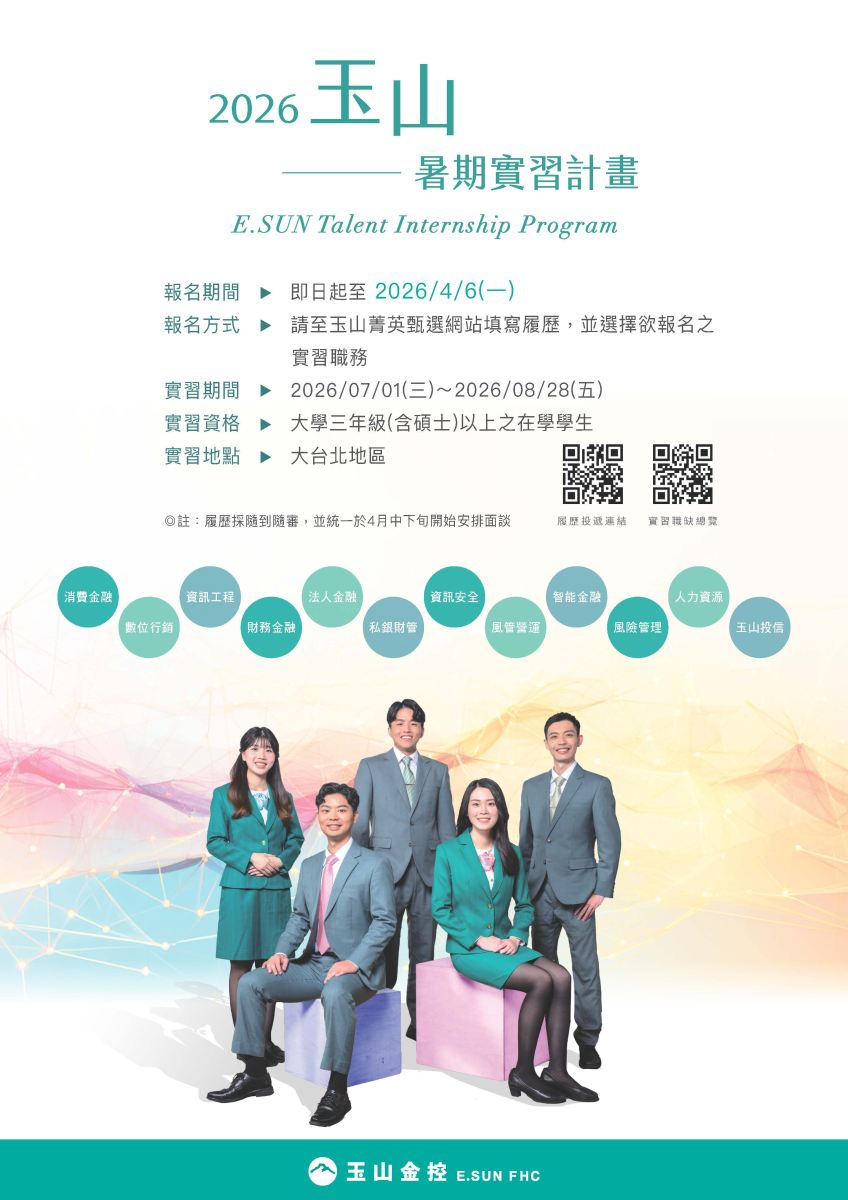 詳細職務內容: 請參閱玉山菁英甄選網站職務總覽